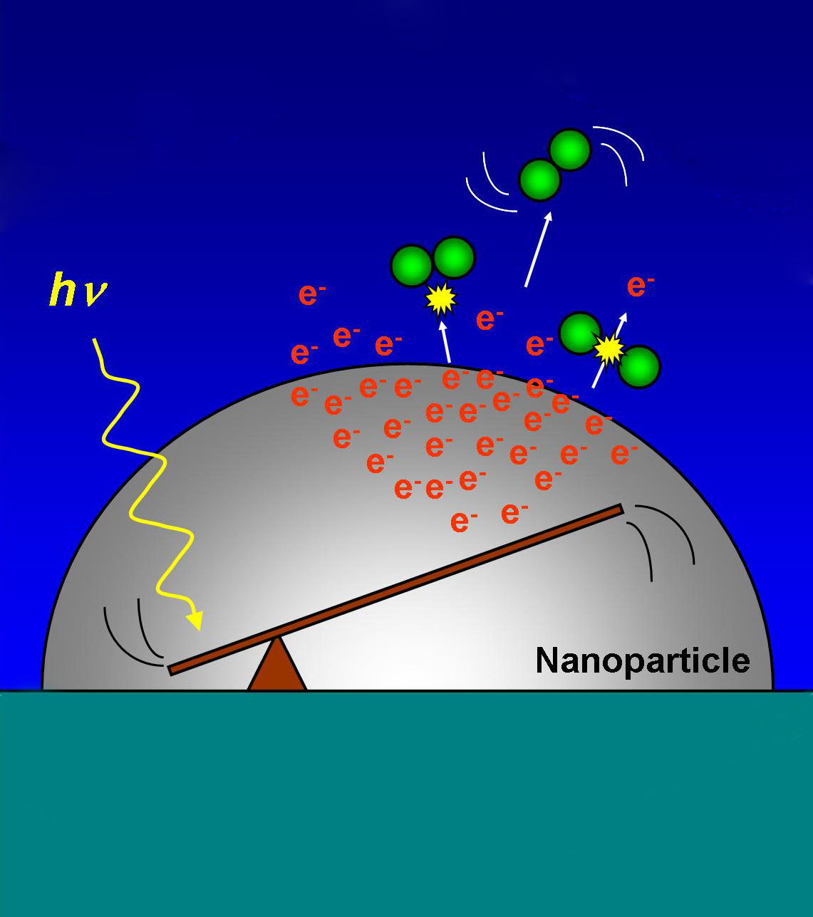 ステンドグラスの美しい色は、そこに含まれた金属ナノ粒子の「プラズモン」と呼ばれる光と電子の相互作用で生じています。我々はプラズモン効果を駆使し、ナノ粒子表面上で起こる光化学反応を何十倍も増強することに成功しました。分光学と表面科学の手法を用い、将来の太陽エネルギーの有効利用も視野に入れた基礎研究を行なっています。
