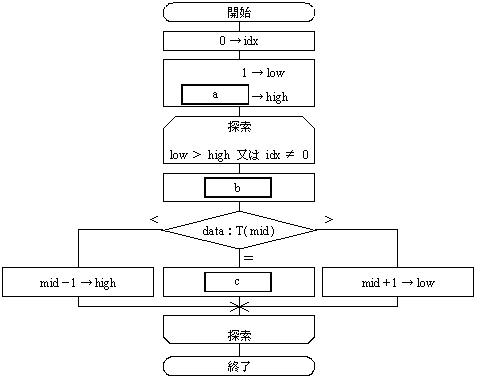 大きさ n の配列 T の各要素 T(1),T(2),…,T(n) に異なる値が昇順に 格納されている。与えられた変数 data と同じ値が格納されている要素を 2 分探索法で見つける。 変数 data の値と一致した要素が見つかると,その要素番号を変数 idx に格納して 検索を終了する。見つからなかったときは,変数 idx を 0 とする。