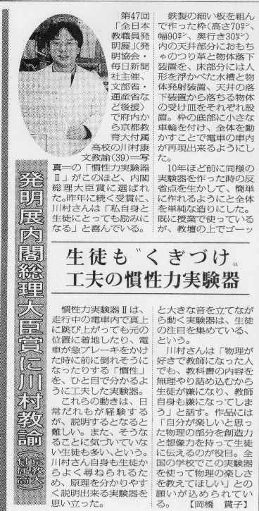 3月14日(日) 毎日新聞 「発明展 内閣総理大臣賞に川村教諭」(慣性力実験器U)の紹介 199903141.jpg