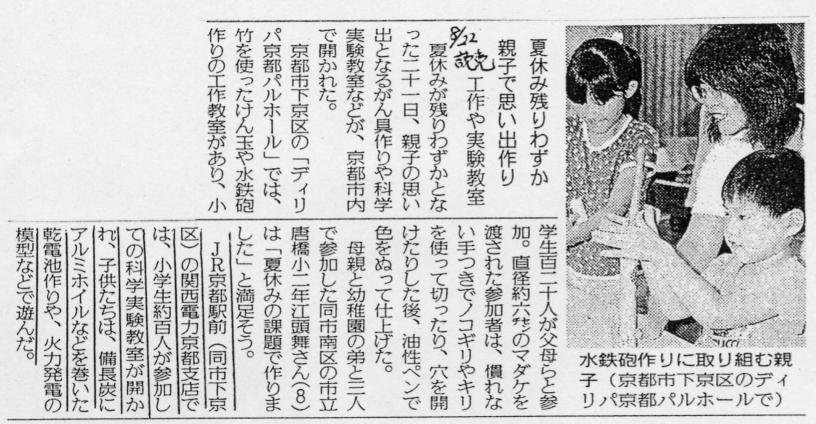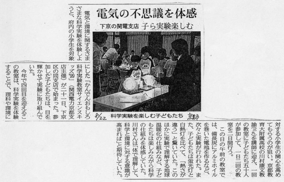 8月22日(日) 京都新聞 「かんでんおもしろ科学実験教室サイエンスキッズ'99」の紹介