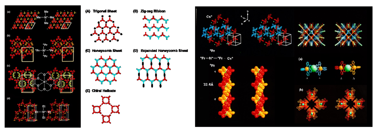 分子の自己組織化によって機能性材料を作るためには、1つの可能性としてナノ多孔質チャンネルをもった結晶に集積させる方法が重要です。このような分子を用いた多孔質材料では、MOF(金属有機構造体:metal organic frameworks)、COF(共有結合性有機構造体:covalent organic frameworks)、HOF(水素結合性有機構造体:hydrogen bonded organic frameworks)などが知られています。しかし、我々の水素結合型錯体はこのどれにも属さない新しいカテゴリーの物質であり、HBCF(水素結合性錯体構造体:Hydrogen-bonded coordination frameworks)と名付けました。この系はMOFのような剛直性を有するが、HOFのような柔軟性を併せ持つ分子材料群になります。このHBCFを用いたナノサイズの大きな空孔を有した多孔質材料の創成は、その柔軟性により空孔骨格を保つのが難しいことが欠点になります。MOFやCOFのような通常のナノチャネル結晶は、一旦空孔構造をもつ構造体を合成した後、ガスなどの分子を導入することが試みられていますが、骨格構造を保つ主体となる結合が水素結合という弱い結合になると、大きなナノ細孔構造を保つのが、難しくなってきます。そのため、自己組織化反応を利用して、空孔内部に導入したい分子を鋳型として、多孔質骨格へ集積させ、すでに多孔質骨格内の空間に分子を導入した状態で結晶を作成しています。下図左には自己組織化反応によってカチオン性物質を鋳型にして多孔質骨格の結晶構造を形成するメカニズムを簡単に示しています。そのため、空孔内に入るモノは、かなり制約を受けることになりますが、様々な分子性カチオンを、その[NiII(Hbim)3]– がつくる水素結合多孔質骨格内に導入することに成功しました。下図右にはいつかの小分子カチオン、クラウンエーテルカチオンの結晶構造を示しています。いずれも、多孔質チャネル骨格の内部に小分子が導入された形になっています。大きな+1電荷のカチオンであると単位空孔あたり、–2電荷を補償しなければいけないため、2つ入る場合が多いが、小さいカチオンでもイオン対を形成することによって、導入されている場合がしばしば見られることが分かりました。