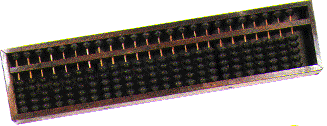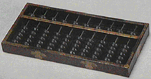 江戸時代初期の大津班播州系そろばんで10桁、天1、地5珠、楕円形。枠 は金の蒔絵のほどこされた黒漆塗り、珠は縞柿、桁棒や止金は銀の合金で作ら れ黒漆塗りの右開き底板が付いている。