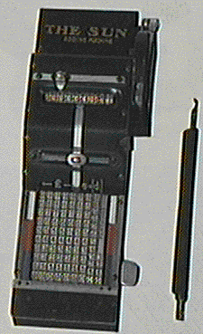 ザ・サン計算機 (c)東京理科大学 1900年の初期にイギリスのテイラー・タイプライター社で製造販売された 携帯用の貨幣計算機。水平歯車(ラック・ギャー)の歯を爪の付いた鉄棒で引 いてデータを入力する。